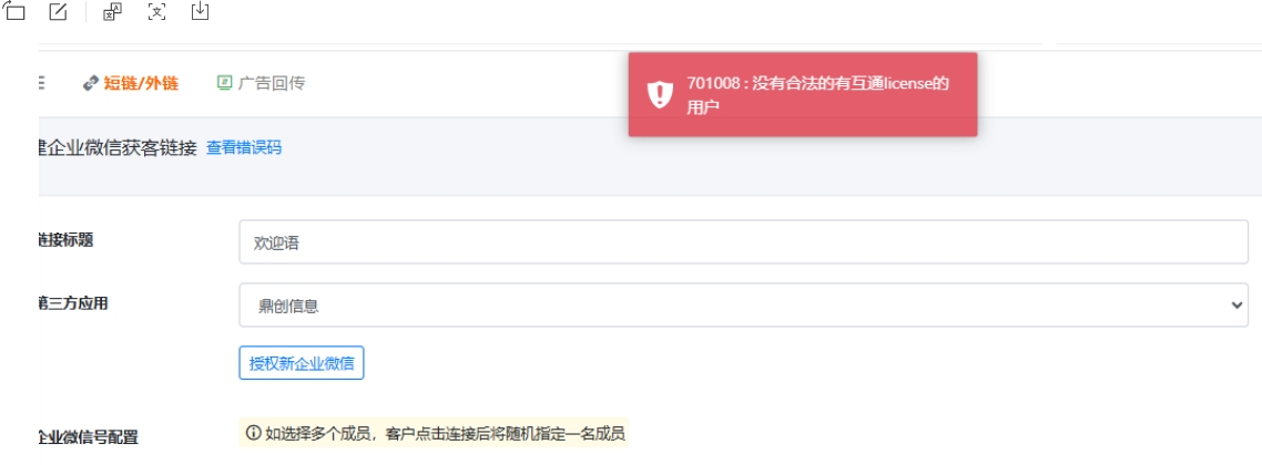 - 服务商模式下,贴加企微获客助手链接时报“701008:没有合法的有互通license的用户”错误,导致无法添加用户