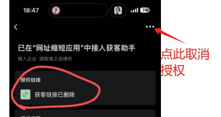 - 解决方案:点击又上角的【...】,删除授权后重新扫码授权;或者在企微管理端后台获客助手页面底部,有一个授权接入获客助手的tab,点进查看详情页,可以操作取消授权后,再重新操作