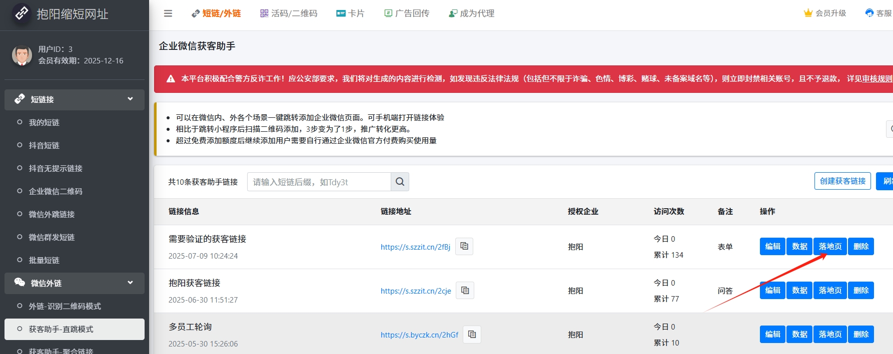 选择【短链/外链】-【获客助手-直跳模式】,这里新建链接,