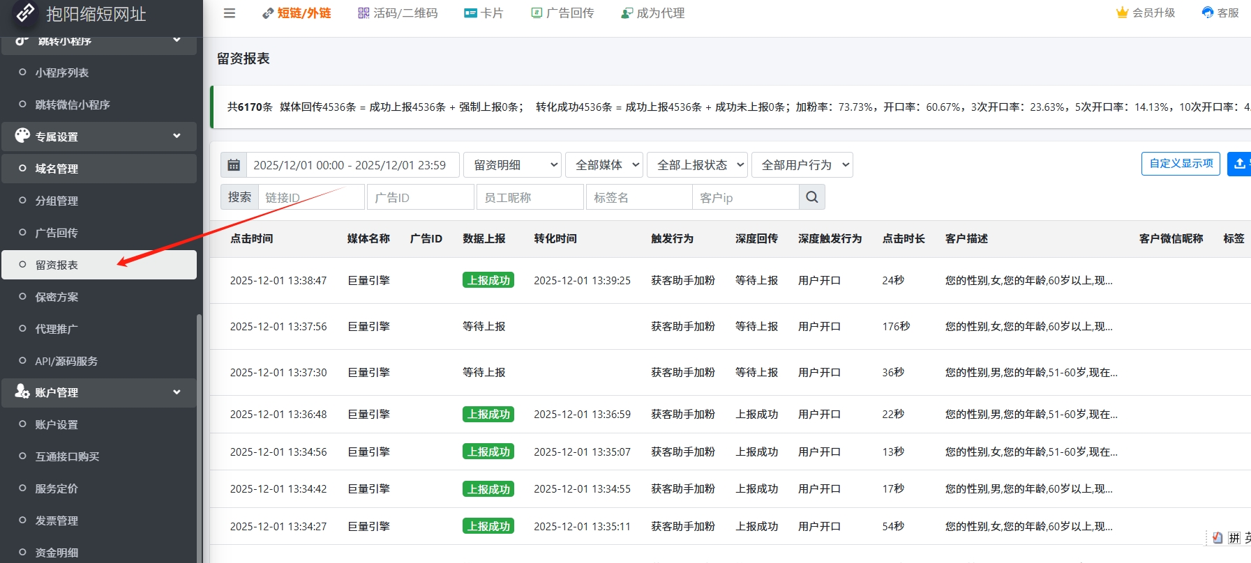 - 可以通过左侧得【留资明细】,更换为汇总数据形式