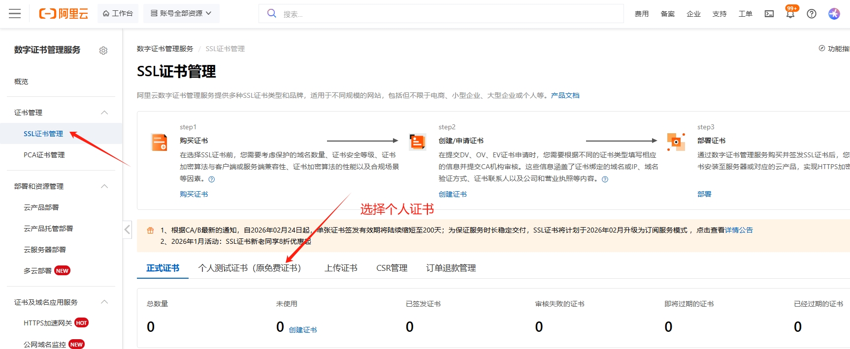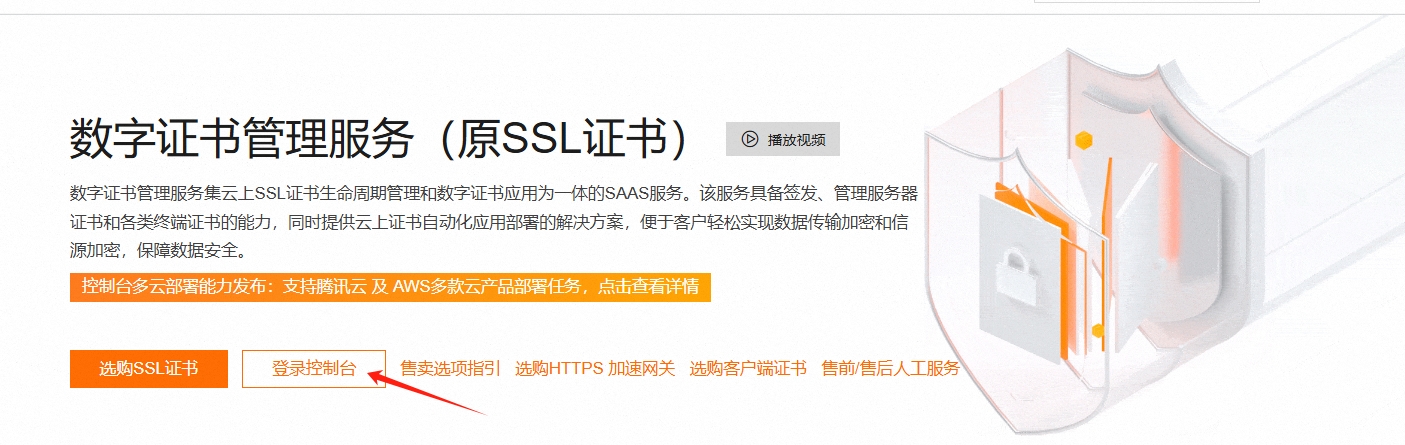 - 到阿里云官网首页,输入SSL,选择【数字证书管理】,然后登录控制台