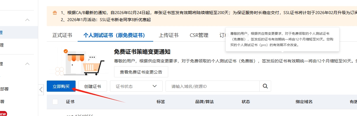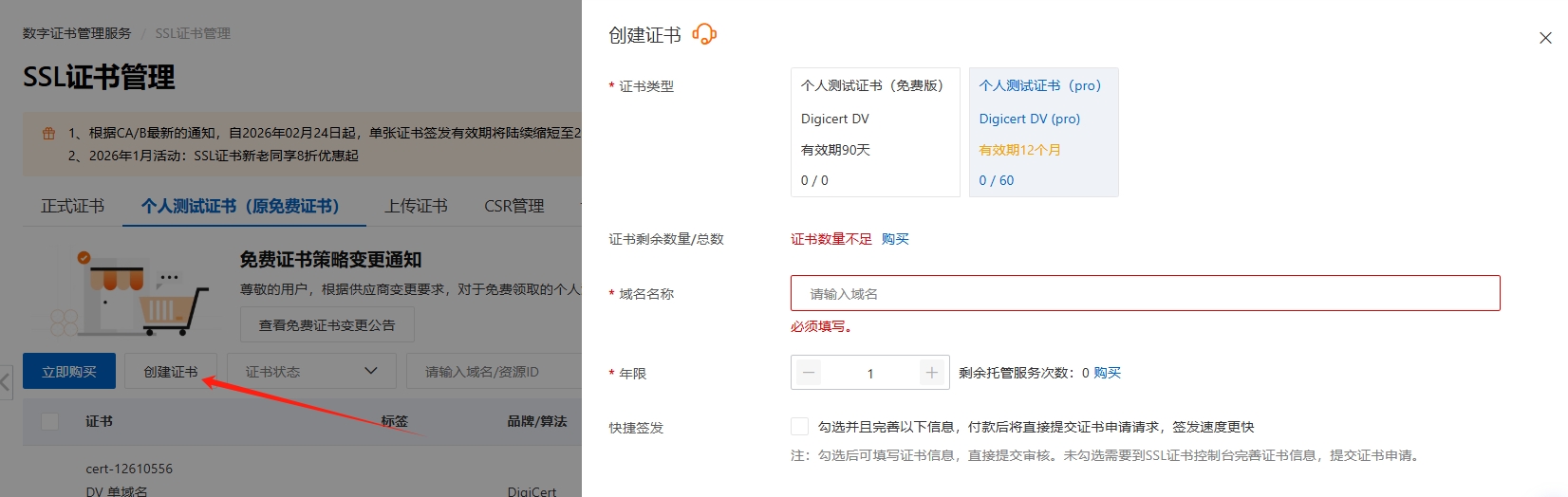 - 购买后,点击【创建证书】,输入你的域名和信息
