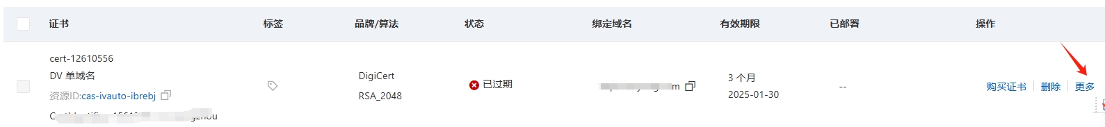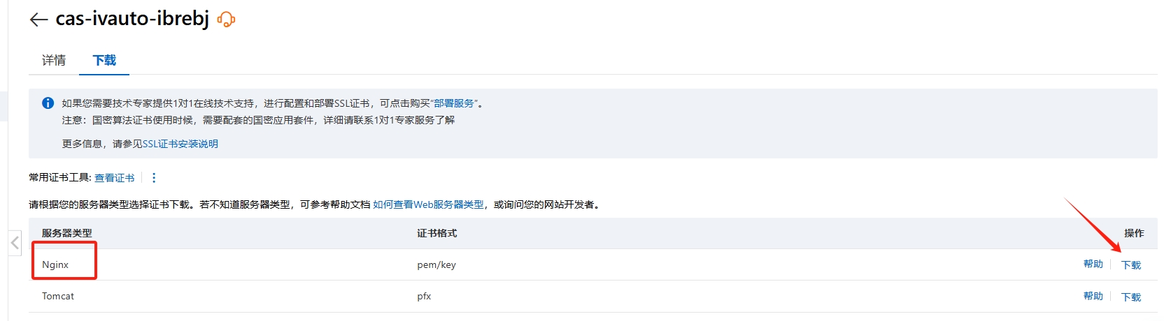 - 点击【更多】,选择【下载】->【Nginx】,把下载好的证书文件提供给客服进行配置