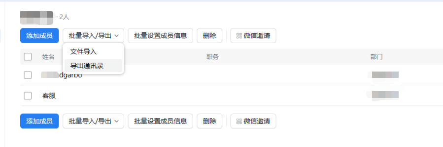 如需批量导出通讯录Excel文件,可点击“批量导入/导出”,选择“导出通讯录”,使用管理员账号扫码后可下载导出文件。